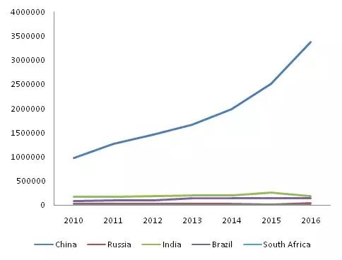 2 金磚各國2010-2016年通過馬德里體系的商標注冊量
